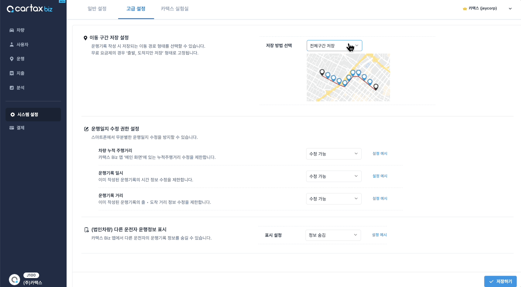 먼저 이동 구간에 대한 표시 방식을 설정할 수 있는데요. 출도착지만 표시할지, 아니면 지도 상에 상세한 경로까지 시각화할 것인지 관리자가 선택할 수 있습니다. 또한 회사 정책에 따라 운전자에게 직접 설정 권한을 부여해 운전자가 자율적으로 표시 방식을 조정하도록 할 수도 있습니다.