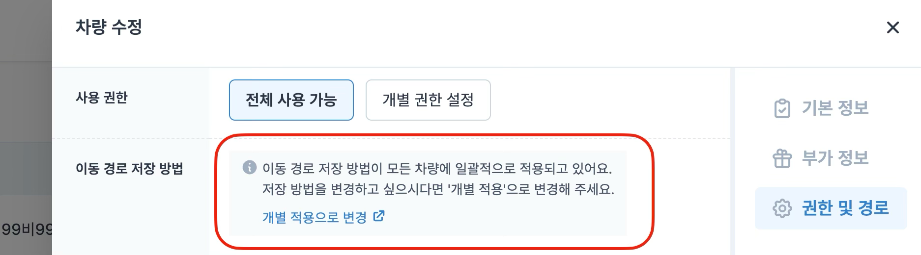 이제 차량 페이지로 진입하고 설정을 변경할 차량을 선택하면 열리는 사이드 페이지에서 우측 하단의 '수정하기' 버튼을 클릭해요. 오른쪽 탭에서 '권한 및 경로'를 선택하면 옵션을 변경할 수 있어요.